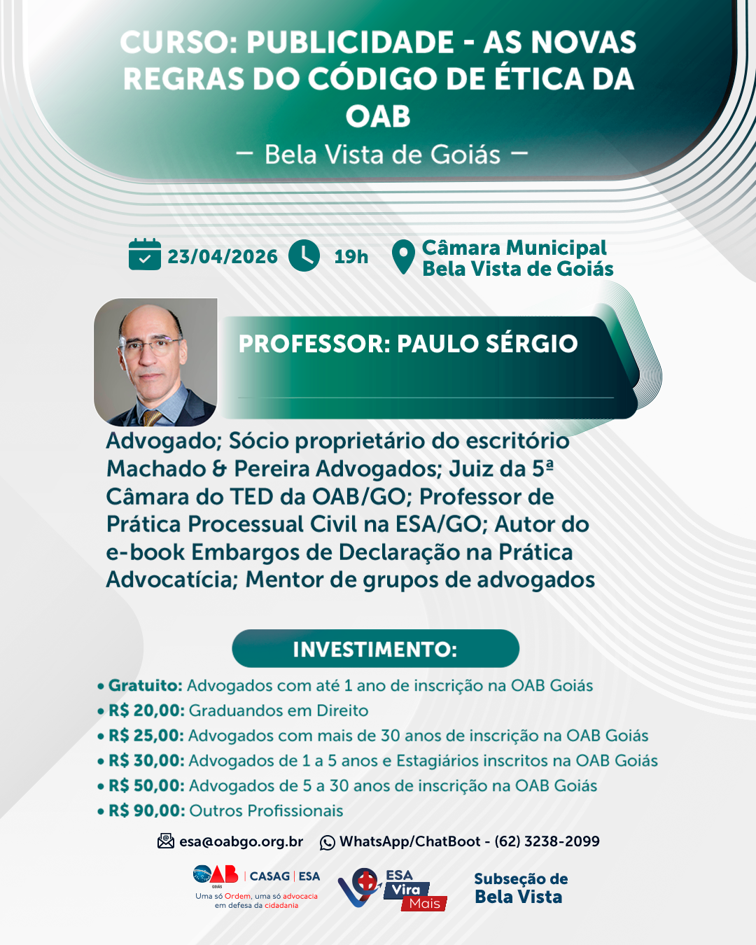 CURSO: PUBLICIDADE - AS NOVAS REGRAS DO CÓDIGO DE ÉTICA DA OAB – BELA VISTA DE GOIÁS