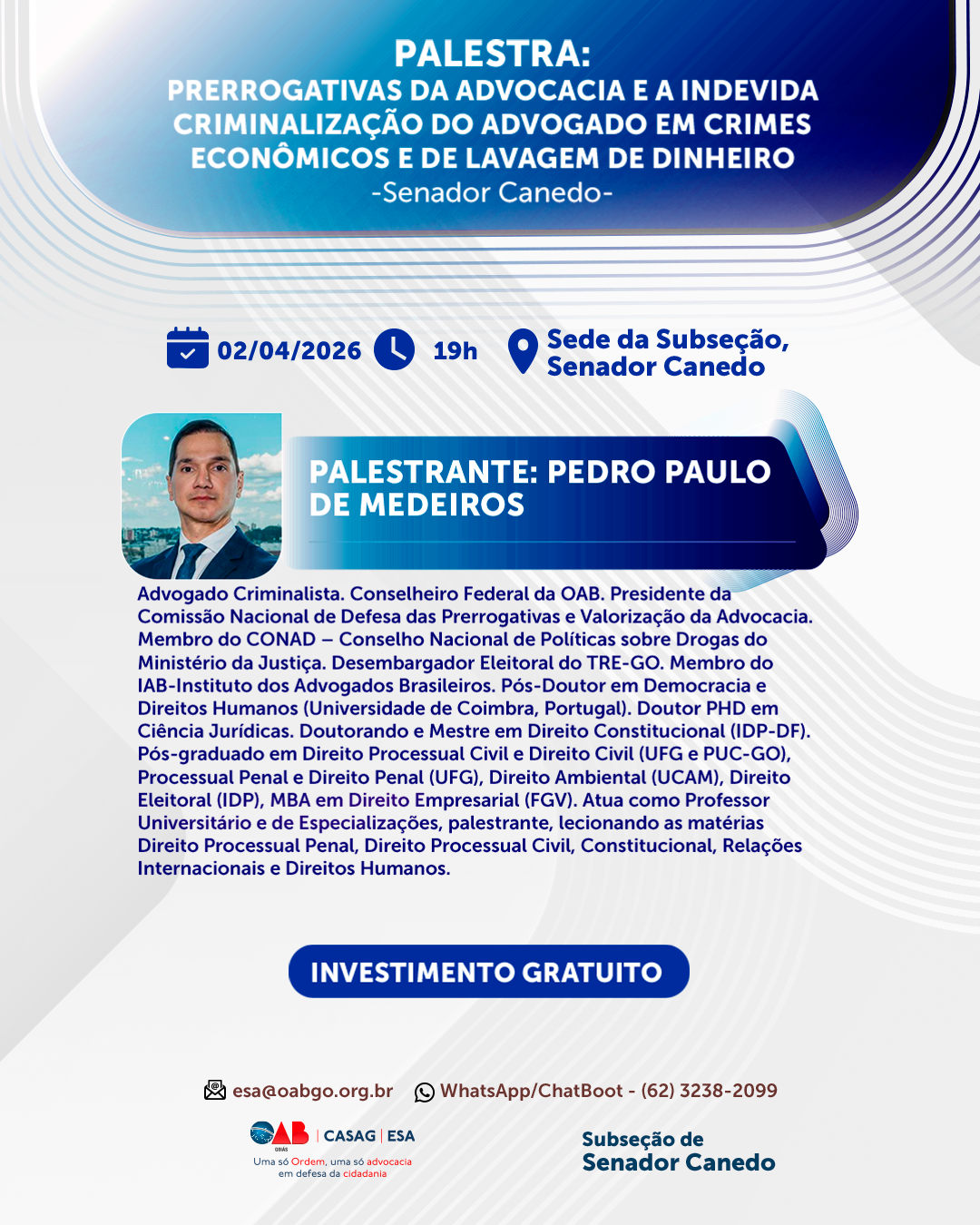 PALESTRA: PRERROGATIVAS DA ADVOCACIA E A INDEVIDA CRIMINALIZAÇÃO DO ADVOGADO - SENADOR CANEDO